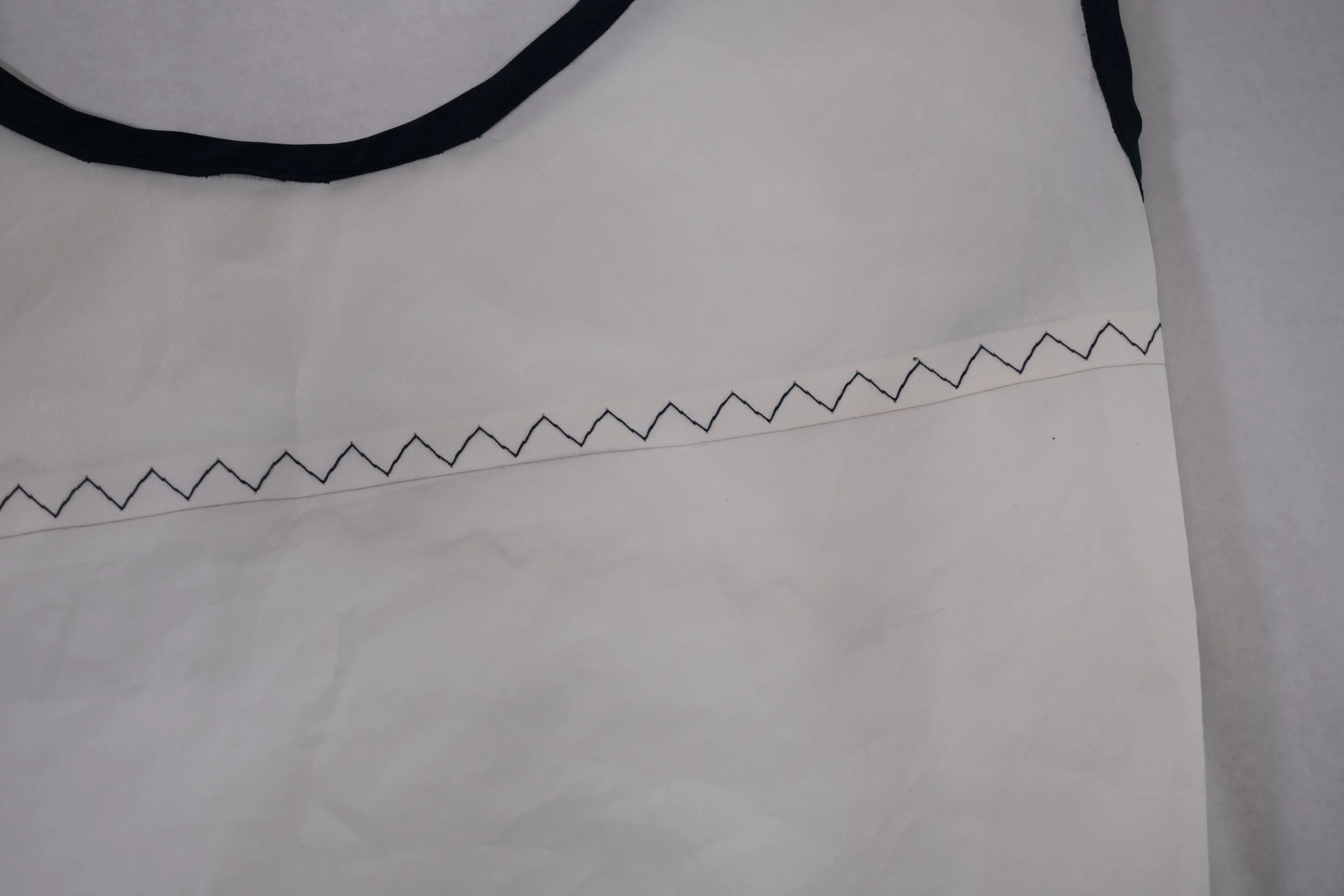 A tote bag made from recycled sail material. The sails used for the construction of all of our bags have been shaped by their time on the water, where every mark is a piece of a story lost to the fierce winds. A bag made not just for the grocery store, but all your adventures and untold stories.